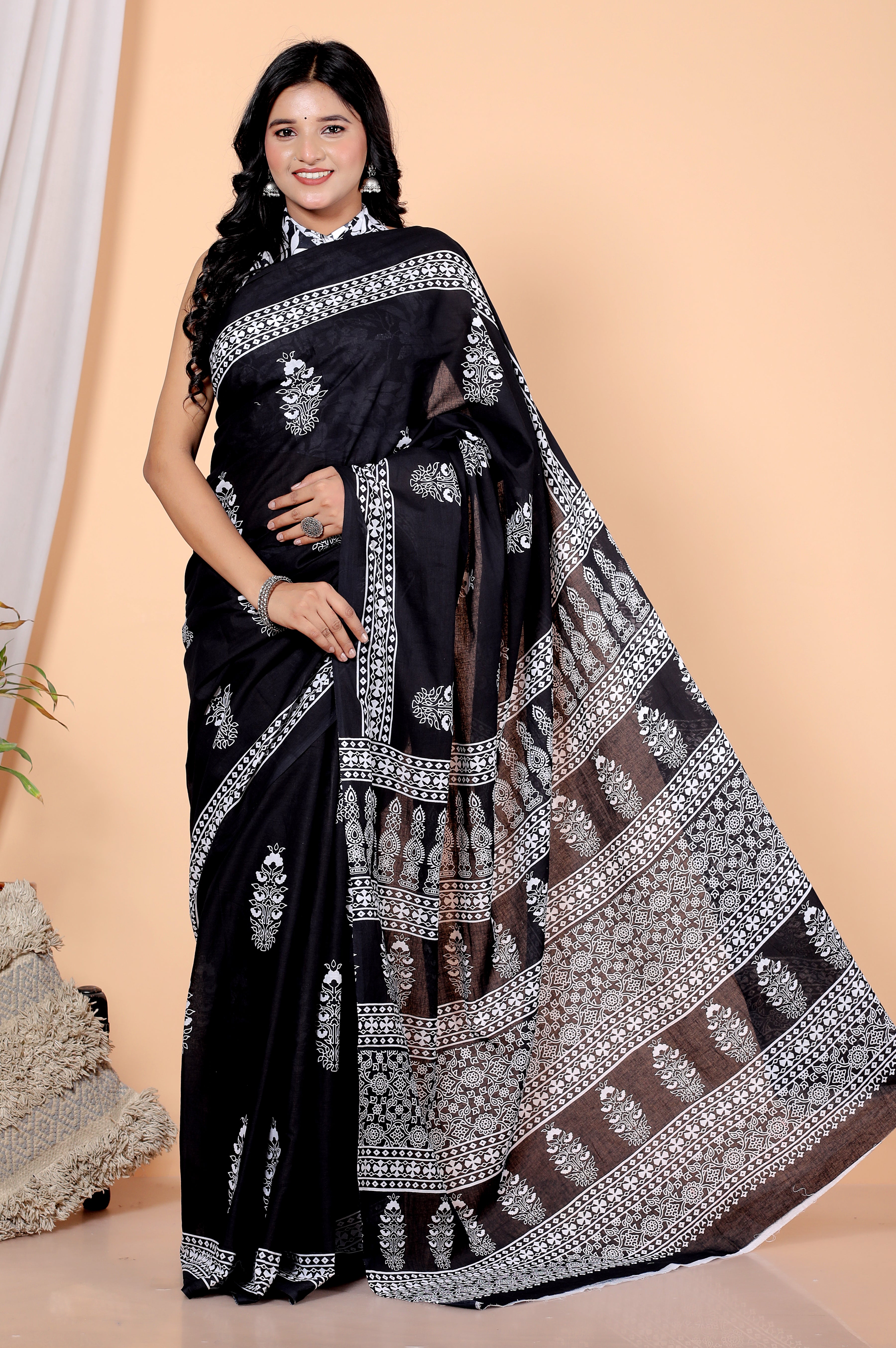 Bagru Block Print Cotton mulmul Sarees With Running Black HS-5047
