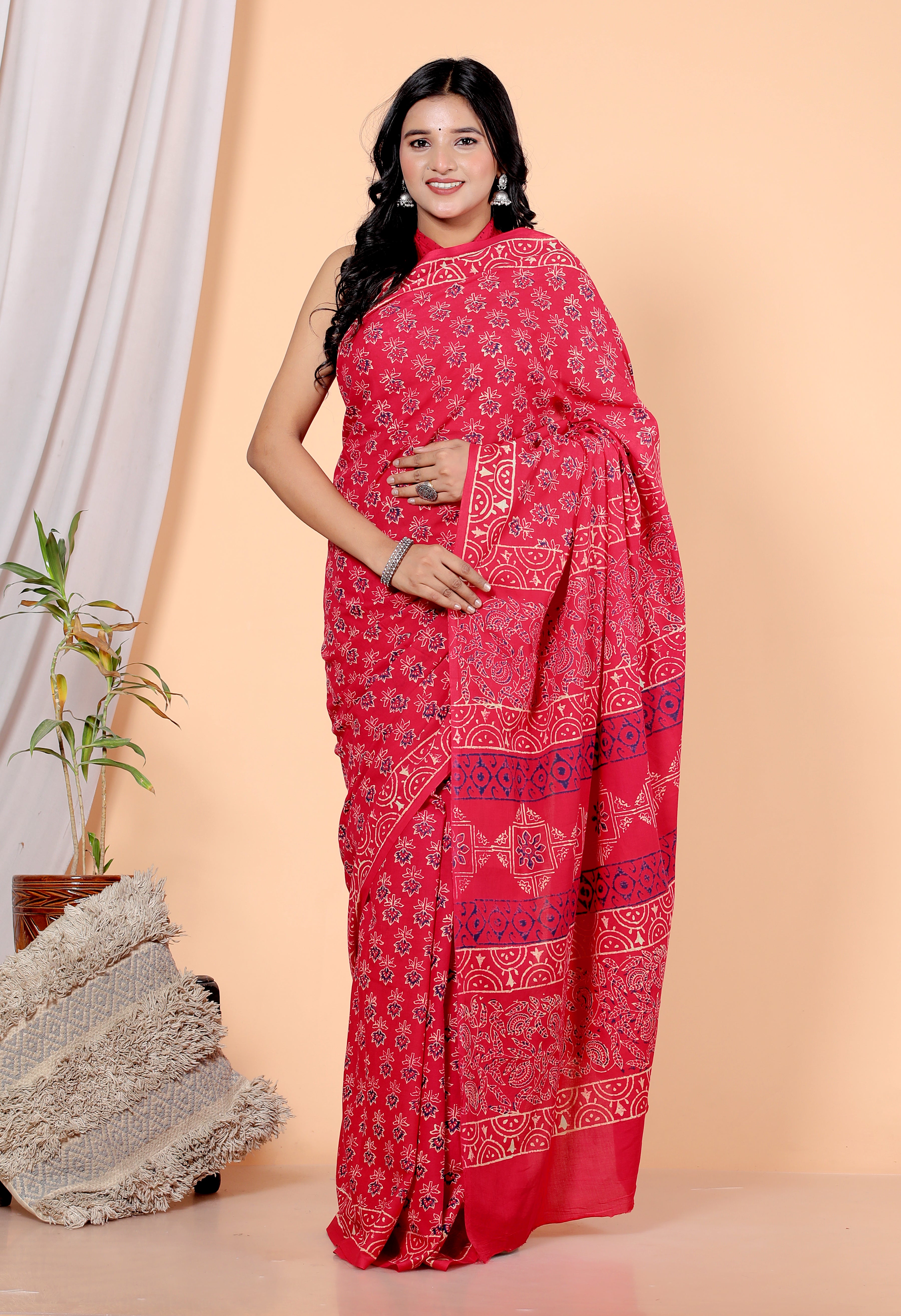 Bagru Block Print Cotton mulmul Sarees With Running Red HS-5063