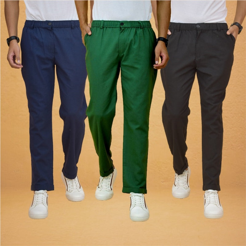 Combo of 3 Black Navy Blue and Bottle Green Cotton Regular Trouser Pants