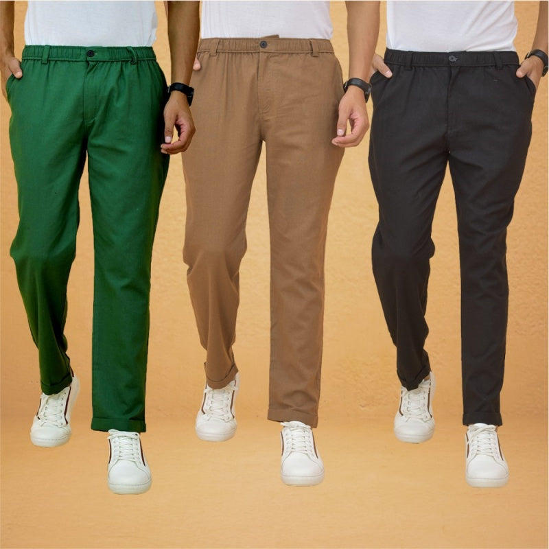 Combo of 3 Brown Black and Bottle Green Cotton Regular Trouser Pants-42385