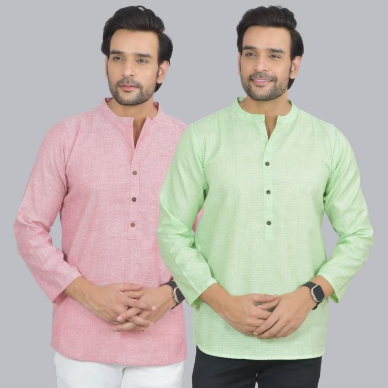 Combo of 2 Men Cotton Self Design Short Kurta Pink and Green