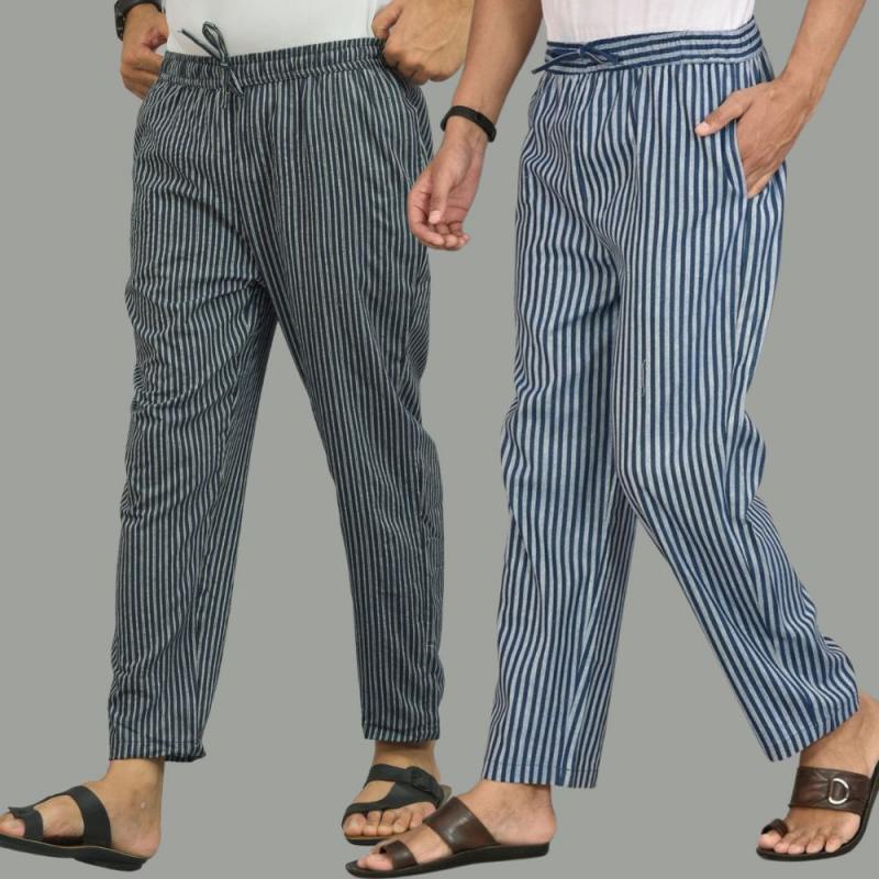 Combo of 2 Men Navy Blue Blue Cotton Handloom Stripe Pant