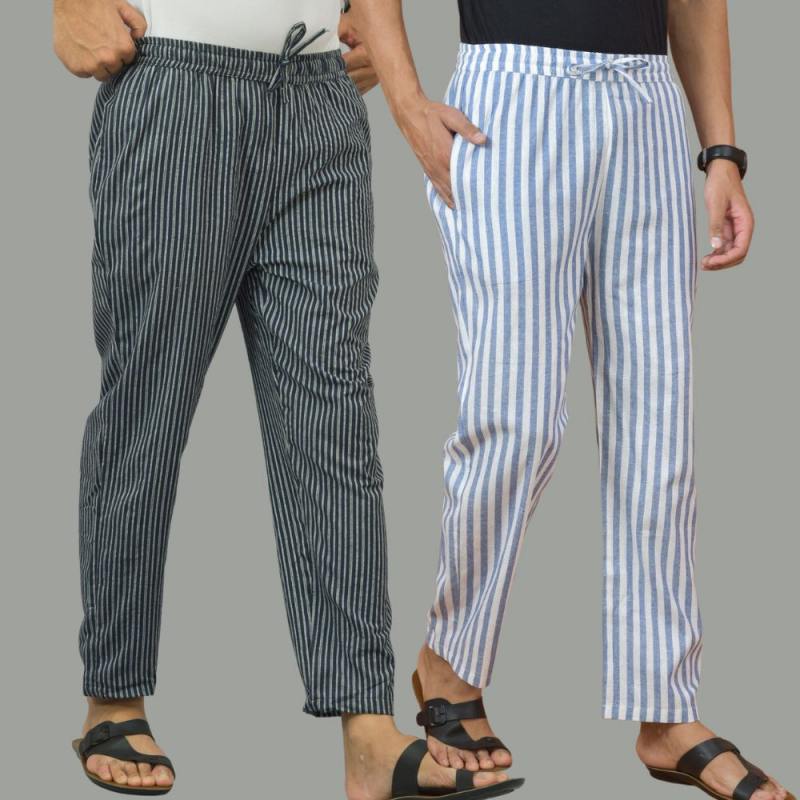 Combo of 2 Men Navy Blue Sky Blue Cotton Handloom Stripe Pant