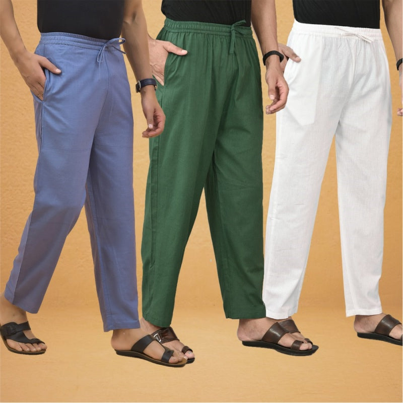 Combo of 3 Men Solid Cotton Flex Pant Bottle Green White and Sky Blue