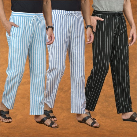 COMBO OF 3 MEN STRIPE COTTON HANDLOOM PANT BLACK BLUE AND SKY BLUE