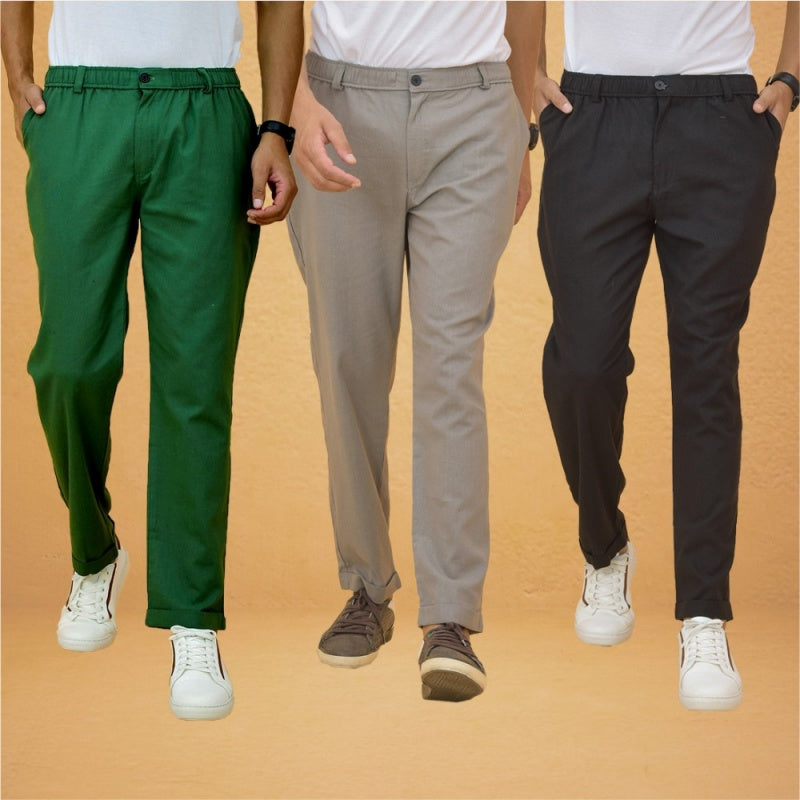 Combo of 3 Gray Black and Bottle Green Cotton Regular Trouser Pants-42387
