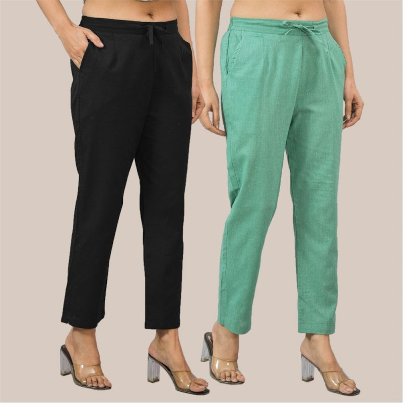 Combo of 2 Green and Black Cotton Flax Women Trouser Pant-10329