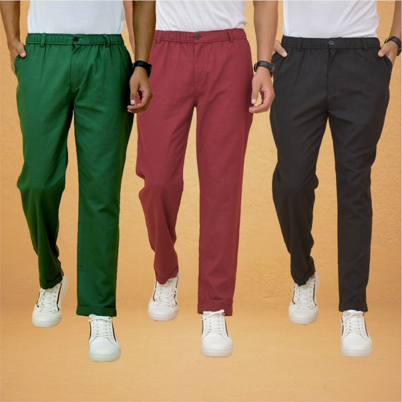 Combo of 3 Maroon Black and Bottle Green Cotton Regular Trouser Pants-42389