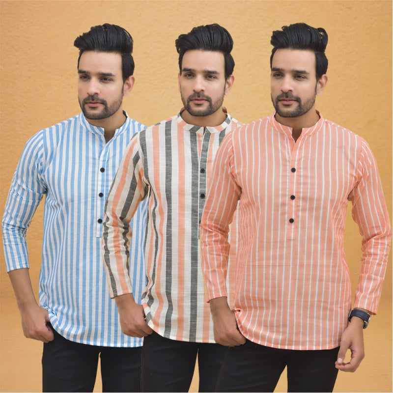 Combo of 3 Men Kurtas Stripe Cotton Handloom Peach Peach and Sky Blue