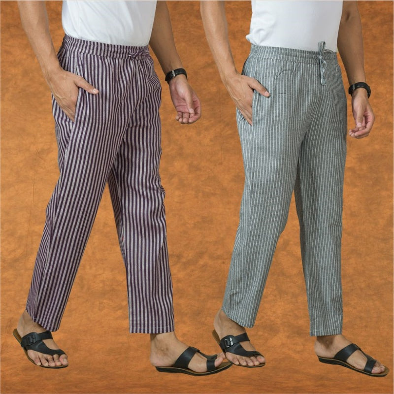 Combo of 2 Men Purple Gray Cotton Handloom Stripe Pant