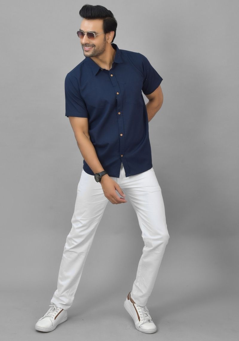 Mens Navy Blue Solid Cotton Shirt