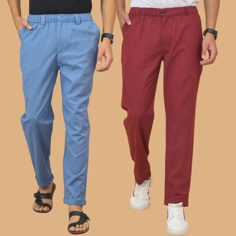 Combo of 2 Sky Blue and Maroon Cotton Regular Trousers