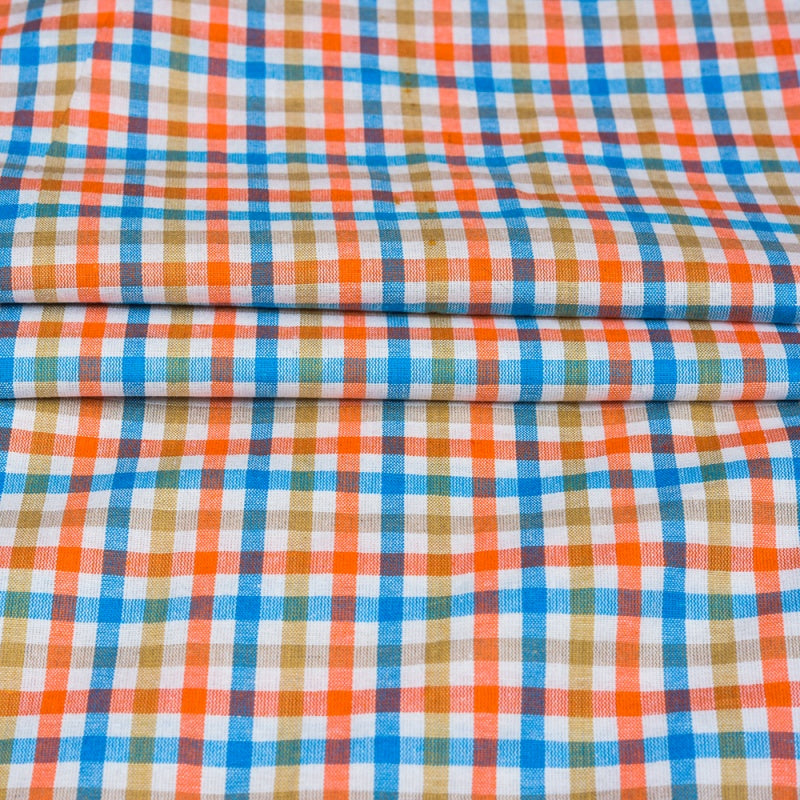 White Orange and Blue Small Checks Cotton Handloom Fabric